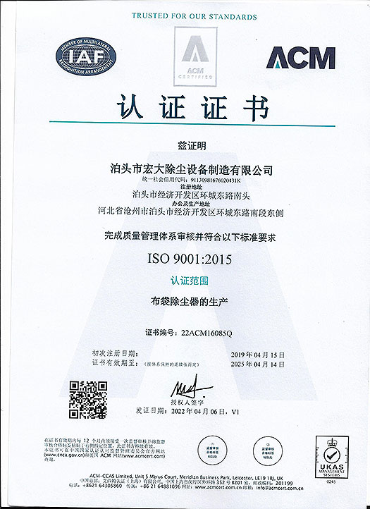 ISO9001認(rèn)證證書(shū)-ISO 9001認(rèn)證證書(shū)-宏大除塵設(shè)備
