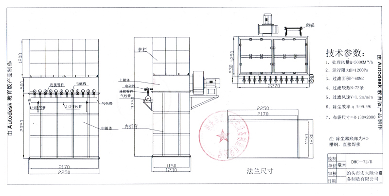 3 、設(shè)備外形及基礎(chǔ)(見附圖),我公司還可根據(jù)用戶場地情況設(shè)計符合用戶要求外形的除塵器。